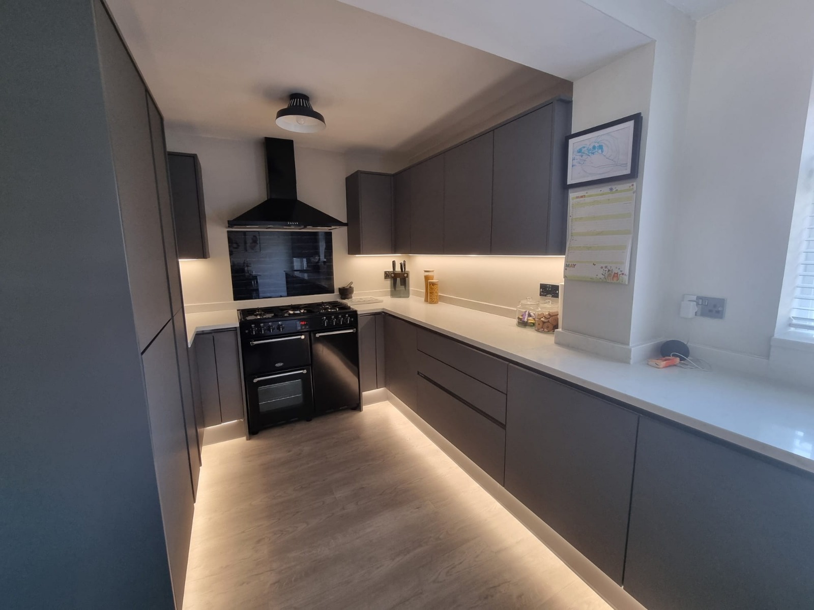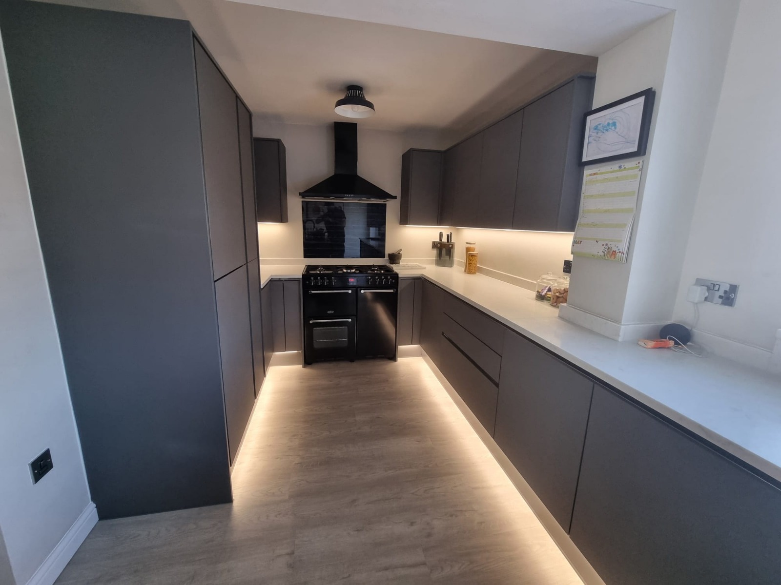 Cool white Ansell LED ribbon installed under cabinets and on kickboards in aluminum profile to diffuse the light equally.